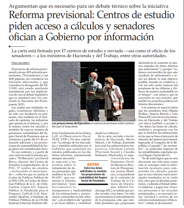 Nota: "Centros de estudios de todos los sectores piden al gobierno entregar datos utilizados para los cálculos del proyecto de pensiones"